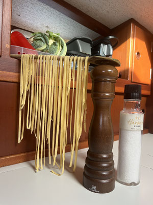 Itz d’ Nudle i dr Sauce schwänke, bis die chlei idicket. Parmesan und Peterli no drunger zieh. Villech bruchts no einisch chli Pastawasser.